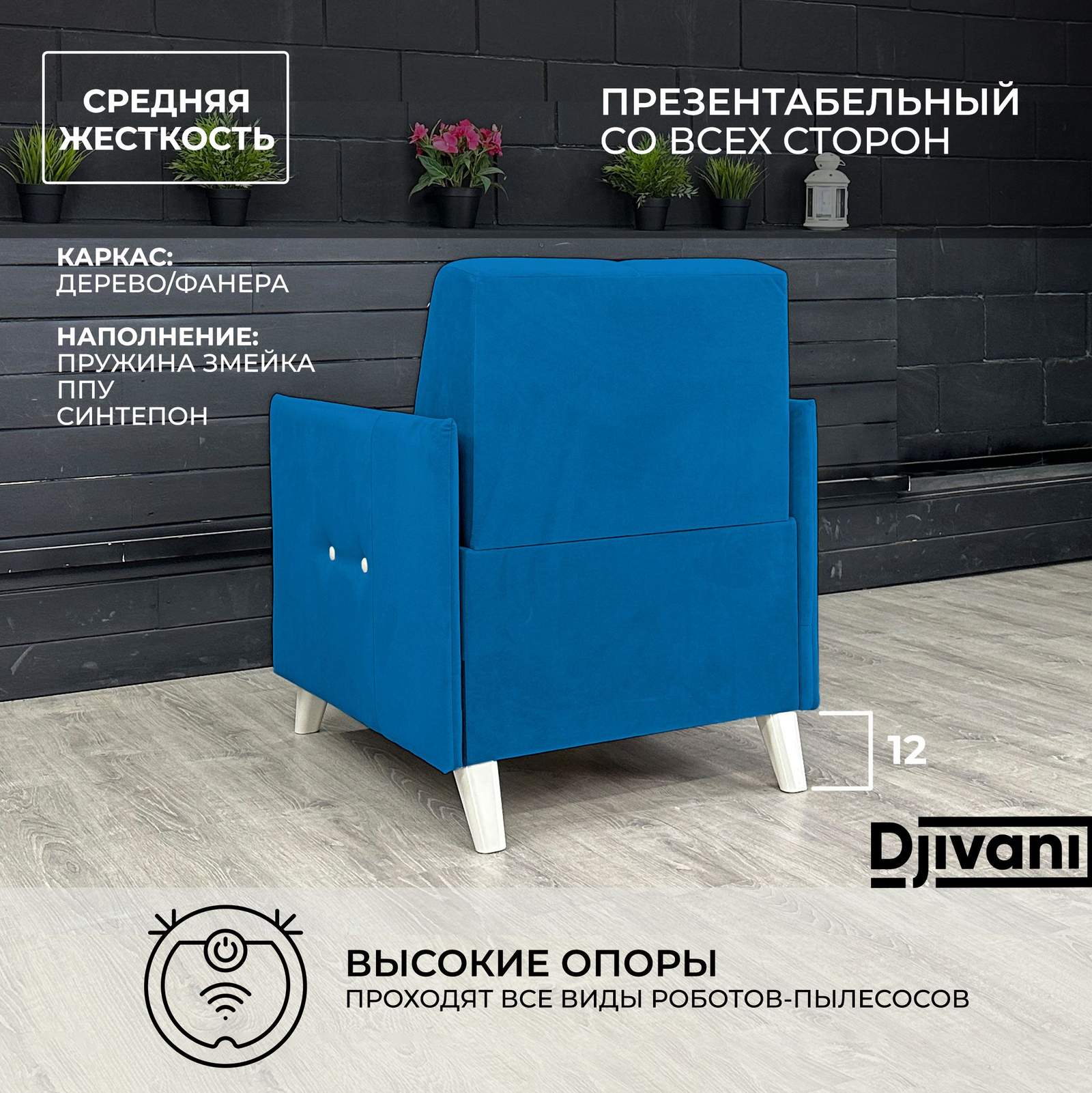 Кресло Бельфор оснащен прочными ножками из ABS-пластика которые изготовлены специально для мягкой мебели и рассчитаны на соответствующие нагрузки, которые обеспечивают устойчивость и надежность конструкции. Высота опор составляет 12 см, что делает кресло стабильным и безопасным и дает возможность использовать робот пылесос для уборки под диваном.